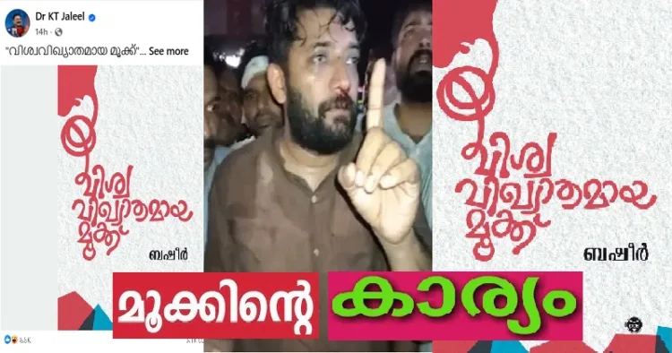 പക്ഷെ, അപ്പോഴും ഷാഫിക്കും ഷാഫിയുടെ മൂക്കിനും കിട്ടുന്ന മൈലേജിനെ ഇടതുപക്ഷത്തെ നേതാക്കള് വരെ ഭക്കുന്നുണ്ടെന്ന് പറയാതെ വയ്യ. ചോരവീണ സമരങ്ങളാണ് കേരളത്തിന്റെ ഭരണമാറ്റത്തിനു കാരണമായിട്ടുള്ളതെന്ന് ചരിത്രം തെളിയിച്ചിട്ടുള്ളതാണ്. പിണറായി വിജയന് സര്ക്കാരിനു മാത്രമാണ് ചോരവീഴാതെയുള്ള ഭരണവും തുടര് ഭരണവും കിട്ടിയത്. അതുകൊണ്ട് ഷാഫിയുടെ മൂക്കിനെ കുറിച്ച് അല്പ്പമൊന്ന് എവുതാതെ പോകാനാവില്ലെന്ന നിലപാടായിരുന്നു പ്രൊഫസറും മന്ത്രിയും ഡോക്ടറുമൊക്കെയായ കെ.ടി. ജലീല്. പറയുമ്പോള് കൊള്ളിച്ചു തന്നെ പറയുന്ന ശീലമുള്ള ജലീലിന്റെ ഫേസ്ബുക്ക് പോസ്റ്റാണ് ഇപ്പോള് വലിയ ചര്ച്ചയായിരിക്കുന്നത്. കാരണം, ജലീല് ഷാഫിയുടെ മൂക്കിനെ മൂക്കേ അല്ലെന്നു സ്ഥാപിക്കാന് കൂട്ടു പിടിച്ചത് വൈക്കം മുഹമ്മത് ബഷീറിനെയാണ്. അദ്ദേഹത്തിന്റെ ‘വിശ്വവിഖ്യാതമായ മൂക്ക്’ എന്ന ചെറുകഥയെ ഉപമിച്ചാണ് ഷാഫിയുടെ മൂക്കിനിട്ട് വീണ്ടും ഇടിച്ചിരിക്കുന്നത്.