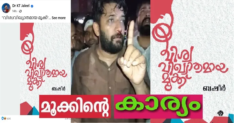 പക്ഷെ, അപ്പോഴും ഷാഫിക്കും ഷാഫിയുടെ മൂക്കിനും കിട്ടുന്ന മൈലേജിനെ ഇടതുപക്ഷത്തെ നേതാക്കള് വരെ ഭക്കുന്നുണ്ടെന്ന് പറയാതെ വയ്യ. ചോരവീണ സമരങ്ങളാണ് കേരളത്തിന്റെ ഭരണമാറ്റത്തിനു കാരണമായിട്ടുള്ളതെന്ന് ചരിത്രം തെളിയിച്ചിട്ടുള്ളതാണ്. പിണറായി വിജയന് സര്ക്കാരിനു മാത്രമാണ് ചോരവീഴാതെയുള്ള ഭരണവും തുടര് ഭരണവും കിട്ടിയത്. അതുകൊണ്ട് ഷാഫിയുടെ മൂക്കിനെ കുറിച്ച് അല്പ്പമൊന്ന് എവുതാതെ പോകാനാവില്ലെന്ന നിലപാടായിരുന്നു പ്രൊഫസറും മന്ത്രിയും ഡോക്ടറുമൊക്കെയായ കെ.ടി. ജലീല്. പറയുമ്പോള് കൊള്ളിച്ചു തന്നെ പറയുന്ന ശീലമുള്ള ജലീലിന്റെ ഫേസ്ബുക്ക് പോസ്റ്റാണ് ഇപ്പോള് വലിയ ചര്ച്ചയായിരിക്കുന്നത്. കാരണം, ജലീല് ഷാഫിയുടെ മൂക്കിനെ മൂക്കേ അല്ലെന്നു സ്ഥാപിക്കാന് കൂട്ടു പിടിച്ചത് വൈക്കം മുഹമ്മത് ബഷീറിനെയാണ്. അദ്ദേഹത്തിന്റെ ‘വിശ്വവിഖ്യാതമായ മൂക്ക്’ എന്ന ചെറുകഥയെ ഉപമിച്ചാണ് ഷാഫിയുടെ മൂക്കിനിട്ട് വീണ്ടും ഇടിച്ചിരിക്കുന്നത്.