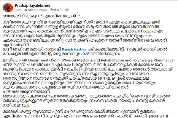 രാജേഷ് കേശവ് ജീവിതത്തിലേക്ക് പതിയെ വരുന്നു: ചിക്തിസയും പരിചരണവും നിഷ്ഠയോടെ; വെല്ലൂരില്‍ നിന്ന് ശുഭകരമായ വാര്‍ത്തകള്‍ ഇനിയും വരട്ടെ; പ്രതാപ് ജയലക്ഷ്മിയുടെ പോസ്റ്റ് വായിക്കാം