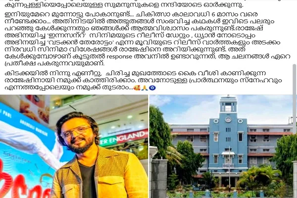 ഇനിയുമേറെ മുന്നോട്ടു പോകാനുണ്ട്… ചികിത്സാ കാലാവധി 6 മാസം വരെ നീണ്ടേക്കാം… അതിനിടയില്‍ അത്ഭുതങ്ങള്‍ സംഭവിച്ച കഥകള്‍ ഇവിടെ പലരും പറഞ്ഞു കേള്‍ക്കുന്നതും ഞങ്ങള്‍ക്ക് ആത്മവിശ്വാസം പകരുന്നുണ്ട്. രാജേഷ് അഭിനയിച്ച ‘ഇന്നസന്റ്’ സിനിമയുടെ റീലീസ് ഡേറ്റും , ധ്യാന്‍ നോടൊപ്പം അഭിനയിച്ച ‘വടക്കന്‍ തേരോട്ടം’ എന്ന മൂവിയുടെ റിലീസ് വാര്‍ത്തകളും അടക്കം നിരവധി സിനിമാ വിശേഷങ്ങള്‍ രാജേഷിനെ അറിയിക്കുന്നുണ്ട്. അത് കേള്‍ക്കുമ്പോഴാണ് കൂടുതല്‍ response അവനില്‍ ഉണ്ടാവുന്നത്, ആ ചലനങ്ങള്‍ ഏറെ പ്രതീക്ഷ പകരുന്നവയുമാണ്.