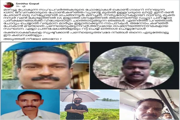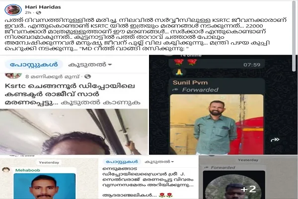 പത്ത് ദിവസത്തിനുള്ളില്‍ മരിച്ച, നിലവില്‍ സര്‍വ്വീസിലുള്ള KSRTC ജീവനക്കാരാണ് ഇവര്‍.. എന്തുകൊണ്ടാണ്ട് KSRTC യില്‍ ഇത്രയും മരണങ്ങള്‍ നടക്കുന്നത്… 22000 ജീവനക്കാര്‍ മാത്രമുള്ളുത്താണ് ഈ മരണങ്ങള്‍… സര്‍ക്കാര്‍ എന്തുകൊണ്ടാണ് നിശബദമാകുന്നത്.. കുട്ടനാട്ടില്‍ പത്ത് താറാവ് ചത്താല്‍ പോലും അന്വേഷിക്കുന്നവര്‍ മനുഷ്യ ജീവന് പുല്ല് വില കല്പിക്കുന്നു… മന്ത്രി പഴയ കുപ്പി പെറുക്കി നടക്കുന്നു… ‘MD റീത്ത് വാങ്ങി രസിക്കുന്നു ‘