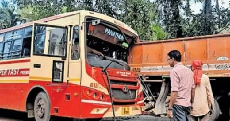 കാഞ്ഞങ്ങാട്: പാണത്തൂർ റോഡിൽ നിർത്തിയിട്ട് മരം കയറ്റുകയായിരുന്ന ലോറിയിൽ കെഎസ്ആർടിസി ബസ് ഇടിച്ച് അപകടം. ഇന്നലെ രാവിലെ 8 മണിയോടെ ബളാംതോട് മുസ്ലിം പള്ളിക്ക് സമീപം നടന്ന അപകടത്തിൽ ബസിന്റെ മുൻഭാഗം പൂർണ്ണമായും തകർന്നു.പാലയിൽ നിന്നും പാണത്തൂരിലേക്കു വരികയായിരുന്ന കെഎസ്ആർടിസി സ്വിഫ്റ്റ് ബസാണ് അപകടത്തിൽപെട്ടത്. അപകട സമയത്ത് ബസിൽ ഡ്രൈവറും കണ്ടക്ടറും മാത്രമായിരുന്നു ഉണ്ടായിരുന്നത്.