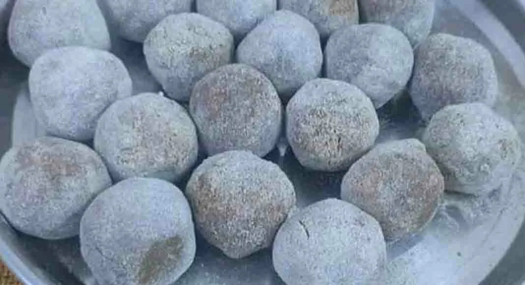അരി വറത്തു മാറ്റുക. പിന്നെ ചെറുപയർ വറക്കുക. ചൂട് കുറഞ്ഞ ശേഷം ഏലക്കായ ചേർത്തു നന്നായി പൊടിച്ചു രണ്ടുംകൂടി യോജിപ്പിക്കുക. ശർക്കര പാനിയാക്കി എടുക്കുക. കുറച്ചു പൊടി മാറ്റി വയ്ക്കുക. ചൂടോടെ തന്നെ കുറേശ്ശെ ശർക്കര പാനി മാവിൽ ഒഴിച്ചു ഉരുളകളാക്കുക. മാറ്റി വച്ച പൊടിയിലും ഇട്ട് ഉരുട്ടുക (ഒരു പാത്രത്തിൽ വെള്ളം വച്ച് ഇടയ്ക്ക് കൈ നനച്ചു ഉരുട്ടി എടുക്കണം). കുറെ നാൾ കേടാവാതെ ഇരിക്കും. തേങ്ങാക്കൊത്ത് ആവശ്യമെങ്കിൽ ചേർക്കാം. തേങ്ങാക്കൊത്തു ചേർത്താൽ പെട്ടെന്ന് കേടാവും കൂടുതൽ നാളത്തേയ്ക്കു വയ്ക്കുകയാണെങ്കിൽ ചേർക്കരുത്.