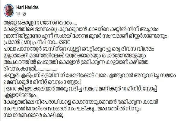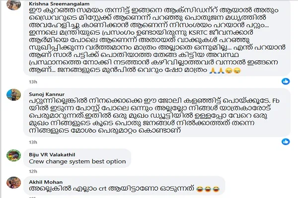 ഇത് ശരിയാണെങ്കില്, ഗണേഷ്കുമാര് മന്ത്രിയോട് പറയാനുള്ളത് പുനര്ചിന്ത അനിവാര്യമാണ് എന്നാണ്. പാളങ്ങള് പോലെ കേരളത്തിലെ നിരത്തുകളെ കാണരുത്. ആകാശം പോലെയല്ല, ടാറിട്ട റോഡുകള്. അവിടെ പാവപ്പെട്ട സാധാരണക്കാര് നടക്കുന്നുണ്ട്. റോഡു വക്കുകളില് കച്ചവടക്കാരുണ്ട്. സ്കൂള് കുട്ടികളുണ്ട്. അങ്ങനെ സമസ്ത മേഖലയിലെയും ആള്ക്കാരുള്ള ഇടമാണ് റോഡുകള്. അവിടെ, KSRTC ബസുകള് ട്രെയിന് സമയം അനുസരിച്ച് ഓടണമെന്ന് ജനങ്ങളുടെ പ്രതിനിധികൂടിയായ മന്ത്രി പറയുമ്പോള്, അത് കുരുതിക്കളിയാണ്. കാലേക്കൂട്ടി മനസ്സിലാക്കി, തീരുമാനം മാറ്റുകയെന്നതാണ് കരണീയമായ കാര്യം.