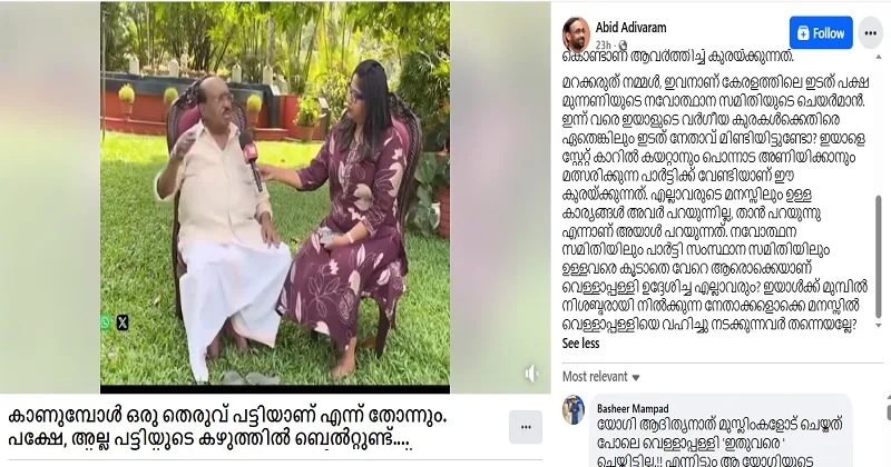 കാണുമ്പോള്‍ ഒരു തെരുവ് പട്ടിയാണ് എന്ന് തോന്നും; പക്ഷേ, അല്ല പട്ടിയുടെ കഴുത്തില്‍ ബെല്‍റ്റുണ്ട്; ഉടമസ്ഥന്റെ പേര് പിണറായി വിജയന്‍ എന്നാണ്; വെള്ളാപ്പള്ളിയെ വിമര്‍ശിച്ച് ആബിദ് അടിവാരത്തിന്റെ ഫേസബുക്ക് പോസ്റ്റ് വൈറലാകുന്നു