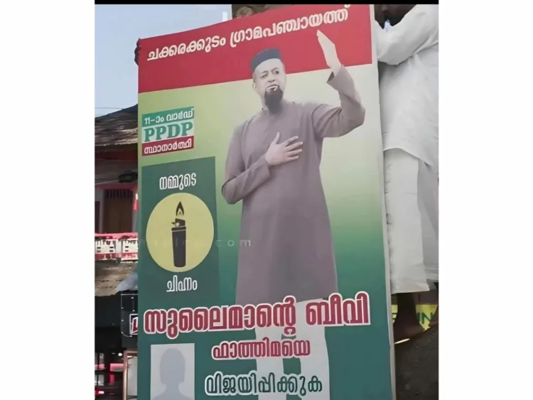 ചക്കരക്കുടം ഗ്രാമപഞ്ചായത്തിലെ പതിനൊന്നാം വാർഡിൽ പി. പി. ഡി. പി സ്ഥാനാര്ഥിയായി മത്സരിക്കുന്ന സുലൈമാൻ്റെ ബീവി ഫാത്തിമയുടെ പ്രചാരണ പോസ്റ്ററുകള് സമൂഹമാധ്യമത്തില് ശ്രദ്ധ നേടുന്നു. സ്ഥാനാര്ത്ഥി പോസ്റ്ററില് ഭാര്യയായ ഫാത്തിമയുടെ ചിത്രത്തിന് പകരം ഭർത്താവ് സുലൈമാന്റെ ചിത്രമാണ് ഉള്ളത്. പോസ്റ്ററിൽ സുലൈമാന്റെ ചിത്രം വലിപ്പത്തിൽ കാണാം. താഴെ മുഖമില്ലാത്ത ഫാത്തിമയുടെ ചെറിയ ചിത്രവും കാണാം. ലാമ്പ് ആണ് ചിഹ്നം.