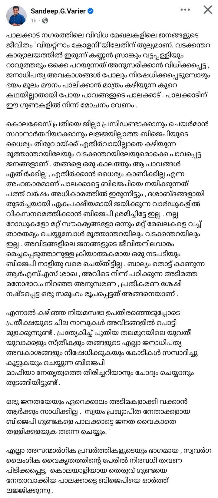 കൊലക്കേസ് പ്രതിയെ ജില്ലാ പ്രസിഡണ്ടാക്കാനും ചെയർമാൻ സ്ഥാനാർത്ഥിയാക്കാനും ലജ്ജയില്ലാത്ത ബിജെപിയുടെ ധൈര്യം തിരുവായ്ക്ക് എതിർവായില്ലാതെ കഴിയുന്ന മൂത്താന്തറയിലേയും വടക്കന്തറയിലേയുമൊക്കെ പാവപ്പെട്ട ജനങ്ങളാണ് . തങ്ങളെ ഒരു കാലത്തും ആ പാവങ്ങൾ എതിർക്കില്ല , എതിർക്കാൻ ധൈര്യം കാണിക്കില്ല എന്ന അഹങ്കാരമാണ് പാലക്കാട്ടെ ബിജെപിയെ നയിക്കുന്നത് പത്ത് വർഷം അധികാരത്തിൽ ഇരുന്നിട്ടും , ദശാബ്ദങ്ങളായി തുടർച്ചയായി ഏകപക്ഷീയമായി ജയിക്കുന്ന വാർഡുകളിൽ വികസനമെത്തിക്കാൻ ബിജെപി ശ്രമിച്ചിട്ടേ ഇല്ല . നല്ല റോഡുകളോ മറ്റ് സൗകര്യങ്ങളോ ഒന്നും മറ്റ് മേഖലകളെ വച്ച് താരതമ്യം ചെയ്യുമ്പോൾ മൂത്താന്തറയിലും വടക്കന്തറയിലും ഇല്ല . അവിടങ്ങളിലെ ജനങ്ങളുടെ ജീവിതനിലവാരം മെച്ചപ്പെടുത്താനുള്ള ക്രിയാത്മകമായ ഒരു നടപടിയും ബിജെപി നാളിതു വരെ ചെയ്തിട്ടില്ല . ബാല്യം തൊട്ട് കാണുന്ന ആർഎസ്എസ് ശാഖ , അവിടെ നിന്ന് പഠിക്കുന്ന അടിമത്ത മനോഭാവം നിറഞ്ഞ അനുസരണ , പ്രതികരണ ശേഷി നഷ്ടപ്പെട്ട ഒരു സമൂഹം രൂപപ്പെട്ടത് അങ്ങനെയാണ് .