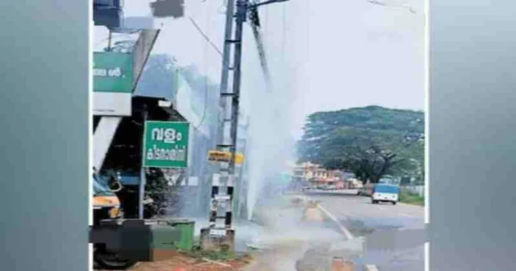 ശുദ്ധജല പൈപ്പിന്റെ എയർ വാൽവ് ഇടിച്ച് തകർത്ത് വാഹനം; പൊട്ടി പൊങ്ങുന്ന വെള്ളം വൈദ്യുതി ലൈനിൽ വീണത് ആശങ്ക പരത്തി