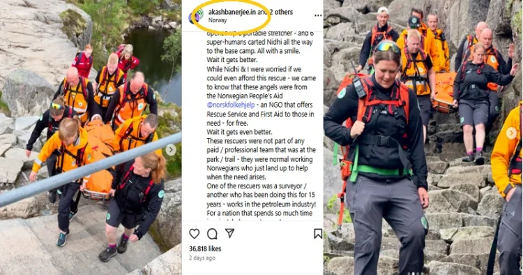 അടുത്തതായി എന്തുചെയ്യണമെന്ന് അറിയാതെ പകച്ചുനിന്ന ബാനര്‍ജിയോട്, നോര്‍വേയുടെ അടിയന്തര നമ്പറായ 113ലേക്ക് വിളിക്കാന്‍ സഹ ഹൈക്കര്‍മാരോട് നിര്‍ദ്ദേശിച്ചു. മനസ്സില്ലാമനസ്സോടെ, എന്ത് പ്രതീക്ഷിക്കണമെന്ന് അറിയാതെ അദ്ദേഹം ആ നമ്പറിലേക്ക് വിളിച്ചു. എന്നിരുന്നാലും, തുടര്‍ന്ന് സംഭവിച്ചത് അത്ഭുതങ്ങളില്‍ കുറഞ്ഞൊന്നുമല്ല. മിനിറ്റുകള്‍ക്കുള്ളില്‍, പ്രതികരിച്ചവര്‍ എന്റെ ഫോണ്‍ ഉപയോഗിച്ച് ഞങ്ങളുടെ സ്ഥലം കൃത്യമായി കണ്ടെത്തി, സഹായം ഉടന്‍ തന്നെ ലഭിക്കുമെന്ന് ഉറപ്പുനല്‍കിയെന്ന് ബാനര്‍ജി എഴുതി. അവരുടെ വാക്ക് പാലിച്ചുകൊണ്ട്, ഒരു മണിക്കൂറിനുള്ളില്‍, ഡോക്ടര്‍മാര്‍ ഉള്‍പ്പെടെയുള്ള രക്ഷാപ്രവര്‍ത്തകരുടെ ഒരു സംഘം അവരുടെ സ്ഥലത്ത് എത്തി. നിധിയുടെ കാലില്‍ സുരക്ഷിതമായി വയ്ക്കാന്‍ ഒരു വാക്വം ബാഗും ബേസ് ക്യാമ്പിലേക്ക് സുരക്ഷിതമായി എത്തിക്കാന്‍ ഒരു പോര്‍ട്ടബിള്‍ സ്‌ട്രെച്ചറും സംഘം ഉപയോഗിച്ചു. ഈ വളണ്ടിയര്‍മാരൊന്നും പ്രൊഫഷണല്‍ രക്ഷാപ്രവര്‍ത്തകരല്ല, മറിച്ച് ആവശ്യമുള്ളവരെ സഹായിക്കാന്‍ സമയം നല്‍കിയ സാധാരണ നോര്‍വീജിയക്കാരാണ് എന്നതാണ് ബാനര്‍ജിയെ അത്ഭുതപ്പെടുത്തിയത്.